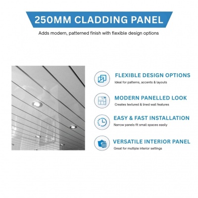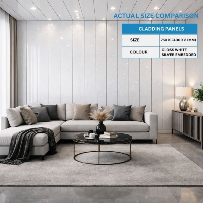 GLOSS WHITE SILVER EMBEDDED 250mm x 2600mm PVC Wall/Ceiling Panel 8mmProduct Code: 250MM-GLOSSWHITESILVER